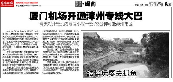 海峽導報:廈門機場昨開通漳州專線大巴 車程75分鐘票價 http://www.fjsen.com/d/2011-03/02/content_4126327.htm 東南網(wǎng)-海峽導報3月2日訊(本網(wǎng)記者 易福進 通訊員 劉婷婷)從昨日起,漳州市民“一站”就可直抵廈門機場。 昨日,廈門航空港集團正式開通廈門機場至漳州的直達巴士專線,75分鐘即可順利直達目的地,票價20元。 該直達專線由廈門空港集團旗下的廈門空港快線運輸有限公司承運,廈門機場至漳州專線起點站分別設在廈門機場到達廳12號門出口及漳州中旅客運站,途經(jīng)漳州賓館,全程70公里,采取全程高速、中途不下客的直達方式。每天對開6班,從早上7點至晚上6點30分,約每兩小時一班,票價20元,與目前的廈漳專線票價基本持平。 據(jù)悉,長久以來,漳州地區(qū)的旅客大多乘坐廈漳專線至廈門市區(qū),再轉(zhuǎn)乘公交車或出租車前往機場,或是直接從漳州打車前往機場,耗時長、費用高;同時,機場至漳州線還存在不少非法營運車輛拉客的現(xiàn)象,給旅客帶來了安全隱患,也增加了運管部門對非法客運的監(jiān)查難度。 廈門機場—漳州專線的開通,不僅方便了旅客出行,減少了旅客的出行時間,也有效遏制了黑車拉客的現(xiàn)象。 “公司自去年9月份起就走訪廈門、漳州各大旅行社及航空售票點,進行市場調(diào)研及客源分析,為漳州專線的開通做了大量的前期準備工作?!睆B門空港快線運輸有限公司有關負責人介紹。 導報記者了解到,除漳州專線外,廈門空港快線已開通廈門機場候機樓至廈門火車站 (北站)、五通碼頭、同安、東渡碼頭的專線。“未來,還將進一步開通廈門機場至晉江、龍巖等地的專線?!笨崭劭炀€有關負責人透露。 值得注意的是,隨著這些往返于廈門機場的直達快線的陸續(xù)開通,廈門機場向周邊城市的輻射能力也將大大增強。 東南快報:廈門機場開通漳州專線大巴 每天對開6班,約每兩小時一班,75分鐘可抵漳州市區(qū) http://digi.dnkb.com.cn/dnkb/html/2011-03/02/content_153558.htm  本報訊(記者 林曉琪 通訊員 劉婷婷)昨日,廈門機場至漳州的直達巴士專線正式試運營,乘機旅客在候機樓上車,75分鐘即可順利抵達漳州市區(qū)中旅客運站。該直達專線每天對開6班,從早上7點至晚上6點30分,約每兩小時一班,票價20元,與目前的廈漳專線票價基本持平。 該直達專線由廈門空港集團旗下的廈門空港快線運輸有限公司承運,廈門機場至漳州專線起點站分別設在廈門機場到達廳12號門出口及漳州中旅客運站,途經(jīng)漳州賓館,全程70公里,采取全程高速、中途不下客的直達方式。 據(jù)悉,長久以來,漳州地區(qū)的旅客大多乘坐廈漳專線至廈門市區(qū),再轉(zhuǎn)乘公交車或出租車前往機場,或是直接從漳州打車前往機場,耗時長、費用高;同時,機場至漳州線還存在不少非法營運車輛拉客的現(xiàn)象,給旅客帶來了安全隱患,也增加了運管部門對非法客運的監(jiān)查難度。廈門機場—漳州專線的開通,不僅方便了旅客出行,減少了旅客的出行時間,也有效遏制了黑車拉客的現(xiàn)象。 據(jù)介紹,廈門空港快線運輸有限公司自去年9月份起就走訪廈門、漳州各大旅行社及航空售票點,進行市場調(diào)研及客源分析,為漳州專線的開通做了大量的前期準備工作。 目前,除漳州專線外,廈門空港快線已開通廈門機場候機樓至廈門火車站(北站)、五通碼頭、同安、東渡碼頭的專線;未來,還將進一步開通廈門機場至晉江、龍巖等地的專線。 |