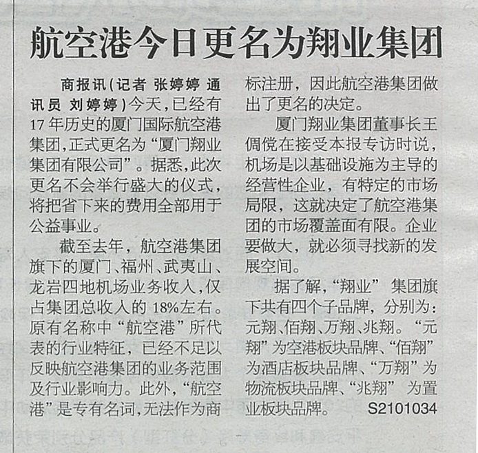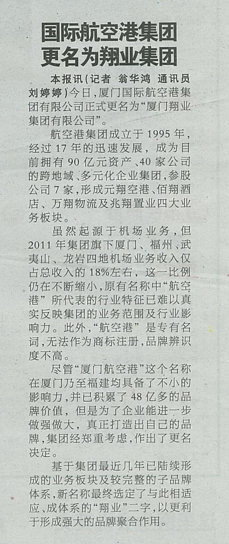 航空港集團(tuán)今日更名為翔業(yè)集團(tuán) 本報(bào)訊(記者 徐景明 通訊員 劉婷婷)1月1日,廈門國際航空港集團(tuán)有限公司將正式更名為“廈門翔業(yè)集團(tuán)有限公司”,致力于成為持續(xù)推動(dòng)以客貨流為主導(dǎo)的現(xiàn)代服務(wù)業(yè)進(jìn)步的企業(yè)集團(tuán),以此吹響了企業(yè)發(fā)展戰(zhàn)略升級(jí)的號(hào)角。 機(jī)場(chǎng)業(yè)務(wù)收入比例在縮小 據(jù)悉,航空港集團(tuán)自1995年成立以來,經(jīng)過17年的迅速發(fā)展,已從一個(gè)僅有1億資產(chǎn)的中小型機(jī)場(chǎng)的單一企業(yè)發(fā)展成為一個(gè)擁有90億資產(chǎn)、40家公司的跨地域、多元化企業(yè)集團(tuán)(包括1家上市公司、5家中外合資公司),參股公司7家,并已形成元翔空港、佰翔酒店、萬翔物流及兆翔置業(yè)四大業(yè)務(wù)板塊。 雖然起源于機(jī)場(chǎng)業(yè)務(wù),但2011年集團(tuán)旗下廈門、福州、武夷山、龍巖四地機(jī)場(chǎng)業(yè)務(wù)收入僅占總收入的18%左右,這一比例仍在不斷縮小,原有名稱中“航空港”所代表的行業(yè)特征已難以真實(shí)反映集團(tuán)的業(yè)務(wù)范圍及行業(yè)影響力;此外,“航空港”是專有名詞,無法作為商標(biāo)注冊(cè),品牌辨識(shí)度不高。 盡管“廈門航空港”這個(gè)名稱在廈門乃至福建已具備了不小的影響力,并積累了48億多的品牌價(jià)值,但是為了企業(yè)進(jìn)一步做強(qiáng)做大,打造出自己的品牌,集團(tuán)經(jīng)鄭重考慮,做出更名決定。 基于集團(tuán)最近幾年已陸續(xù)形成下屬元翔空港、佰翔酒店、萬翔物流、兆翔置業(yè)等業(yè)務(wù)板塊及較完整的子品牌體系,新名稱最終選定了與這些子品牌相適應(yīng)、成體系的“翔業(yè)”二字,以利于形成強(qiáng)大的品牌聚合作用。據(jù)介紹,“翔業(yè)”取意“翱翔天際、鴻業(yè)遠(yuǎn)圖”,寓意“事業(yè)翔飛”,同時(shí)也喻示翔業(yè)集團(tuán)擁有以“翔”為代表的產(chǎn)業(yè)群。 一個(gè)有關(guān)“翔”的夢(mèng)想 名字之變,展現(xiàn)了企業(yè)使命和愿景的升級(jí),也抒寫著企業(yè)發(fā)展延續(xù)的脈絡(luò)。航空港集團(tuán)起源于機(jī)場(chǎng)業(yè),對(duì)“翔”有著與生俱來的情結(jié),“自由翱翔”的信念歷久彌堅(jiān),更形成了一股積極回饋社會(huì)的力量。 1996年,自籌資金開展大規(guī)模機(jī)場(chǎng)建設(shè)、正迎來還貸高峰的航空港集團(tuán)時(shí)艱未敢忘己任,決定找一個(gè)最窮的地方建設(shè)一所希望小學(xué)。多方輾轉(zhuǎn)打聽后,航空港集團(tuán)來到了漳州華安吉土村,投入65萬元,為那些帶著咸菜、走數(shù)十里山路到土墻祖祠上課的孩子們建立起了一所嶄新的校舍,并將學(xué)校取名為吉“翔”希望小學(xué)。通過持續(xù)至今的捐資助學(xué)、結(jié)對(duì)幫扶等方式,翔業(yè)集團(tuán)已幫許許多多山里的孩子“飛翔”到更廣闊的天地。 引領(lǐng)“翔”品牌家族 墨守陳規(guī)不是翔業(yè)的個(gè)性,從初試鶯啼開始,翔業(yè)集團(tuán)就不斷創(chuàng)新著“翔”的方式和路徑,領(lǐng)翔行業(yè)發(fā)展,創(chuàng)下機(jī)場(chǎng)業(yè)數(shù)個(gè)“第一”;拓展非航空業(yè)務(wù),翔出廣闊天地。閃越騰挪之間,“翔”的內(nèi)涵日漸豐富,前方愈顯海闊天空?!霸杩崭邸?、“佰翔酒店”、“萬翔物流”、“兆翔置業(yè)”四個(gè)互相支撐、協(xié)同促進(jìn)的業(yè)務(wù)板塊逐漸成形,一個(gè)嶄新而穩(wěn)固的“翔”品牌格局隨之呈現(xiàn)——“翔業(yè)”集團(tuán)應(yīng)運(yùn)而生,成為引領(lǐng)“翔”品牌家族的母品牌。 “元翔”為空港板塊品牌,旗下?lián)碛袕B門高崎、福州長樂、南平武夷山、龍巖冠豸山四個(gè)機(jī)場(chǎng)及相關(guān)候機(jī)樓運(yùn)營、地勤服務(wù)、貨站、機(jī)務(wù)等公司?!鞍巯琛睘榫频臧鍓K品牌,已形成專業(yè)從事高端酒店投資和運(yùn)營管理的酒店管理集團(tuán),擁有白金五星級(jí)、五星級(jí)、四星級(jí)、度假山莊等多樣性酒店產(chǎn)品?!叭f翔”為物流板塊品牌,旗下有萬翔網(wǎng)商、航空港物流園和萬翔現(xiàn)代物流三家公司?!罢紫琛睘橹脴I(yè)板塊品牌,包含碼頭、臨港地產(chǎn)、機(jī)電智能、廣告、城際客運(yùn)、花卉科技等產(chǎn)業(yè)。 【相關(guān)】 不辦更名儀式 省下費(fèi)用全投入公益 航空港集團(tuán)更名為翔業(yè)集團(tuán),這一動(dòng)作沒有提前公布,更沒有舉行盛大的儀式,延續(xù)了其一貫低調(diào)務(wù)實(shí)的風(fēng)格。在更名當(dāng)日,翔業(yè)集團(tuán)表示,將把未舉辦儀式節(jié)省下來的費(fèi)用全部用于公益事業(yè)。 據(jù)翔業(yè)集團(tuán)新聞發(fā)言人孫長力介紹,為更好地踐行企業(yè)20多年來所一直堅(jiān)持的“追求卓越績效,盡心奉獻(xiàn)社會(huì)”宗旨,此次更名不舉行慶典儀式,所節(jié)省費(fèi)用悉數(shù)投于公益事業(yè)。據(jù)悉,十多年來,翔業(yè)集團(tuán)先后資助了華安吉翔小學(xué)等十余所學(xué)校,共投入4000多萬元用于公益事業(yè)。 《海峽導(dǎo)報(bào)》1月1日 第02版  《廈門晚報(bào)》1月1日 第3版