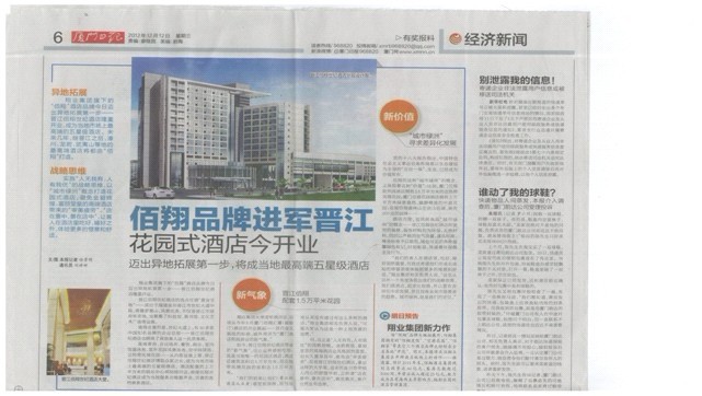 【異地拓展】 翔業(yè)集團(tuán)旗下的“佰翔”酒店品牌今日邁出異地拓展第一步——晉江佰翔世紀(jì)酒店隆重開業(yè),成為當(dāng)?shù)厥袌錾献罡叨说奈逍羌壘频?。未來幾年,繼晉江之后,漳州、龍巖、武夷山等地的最高端酒店將都由“佰翔”打造。
