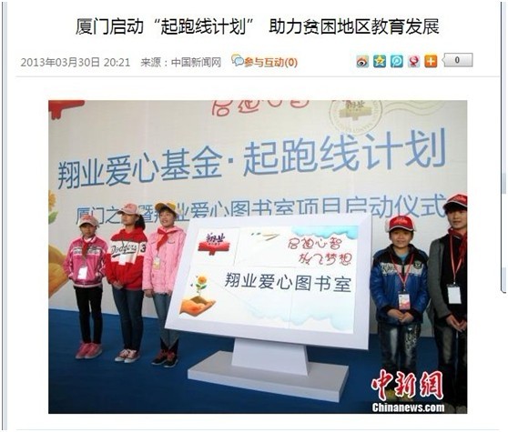 新聞鏈接:http://www.chinanews.com/edu/2013/03-30/4690909.shtml;  3月30日,福建省首個由國有企業(yè)出資并自主運(yùn)營的非公募公益基金——翔業(yè)愛心基金會開啟其首個公益項(xiàng)目——“起跑線計(jì)劃”,助力福建貧困地區(qū)教育,專事為福建省貧困地區(qū)學(xué)校提供課外讀物。今后五年內(nèi),該愛心基金會將完成300所貧困地區(qū)小學(xué)“愛心圖書室”的建設(shè)。 楊伏山 中新網(wǎng)廈門3月30日電 (記者 楊伏山) 福建省首個由國有企業(yè)出資并自主運(yùn)營的非公募公益基金——翔業(yè)愛心基金會,30日開啟其首個公益項(xiàng)目——“起跑線計(jì)劃”,助力福建貧困地區(qū)教育,專事為福建省貧困地區(qū)學(xué)校提供課外讀物。 來自廈門、福州、南平、龍巖、漳州、泉州六地共70所小學(xué),成為該計(jì)劃的首批捐贈對象。這些受贈學(xué)校師生代表當(dāng)天獲邀前來廈門參加翔業(yè)愛心基金·起跑線計(jì)劃廈門之旅,共同見證了愛心圖書室項(xiàng)目啟動儀式。 該愛心基金會理事會理事長、廈門翔業(yè)集團(tuán)有限公司黨委副書記方弘哲告訴中新網(wǎng)記者,今年1月1日適逢“廈門國際航空港集團(tuán)有限公司”正式更名“廈門翔業(yè)集團(tuán)有限公司”一周年,集團(tuán)不舉辦更名儀式和周年慶活動,將節(jié)省下來的預(yù)算,聯(lián)合下屬“元翔空港”、“佰翔酒店”、“萬翔物流”、“兆翔置業(yè)”四大產(chǎn)業(yè)板塊四十多家子公司的公益預(yù)算,共同出資1000萬元注冊成立了“翔業(yè)愛心基金會”,其中首期原始基金為500萬元。 他說,該基金會將只專心做一件事,就是踏踏實(shí)實(shí)為貧困地區(qū)的就學(xué)孩子辦實(shí)事,通過舉辦起跑線之旅、閱讀指導(dǎo)交流等活動;捐贈愛心圖書室,包括教學(xué)輔助用書、課外圖書雜志、電子閱讀設(shè)備、視頻閱讀設(shè)備,以及遠(yuǎn)程數(shù)字資源共享等,幫助貧困地區(qū)的青少年增長見識、開拓視野,打造一個公平的起跑機(jī)會。 “起跑線計(jì)劃”正式開跑后,五年內(nèi)翔業(yè)愛心基金會將完成300所貧困地區(qū)小學(xué)“愛心圖書室”的建設(shè),幫助解決貧困地區(qū)兒童不知道買什么書、買不起書、有效閱讀少等問題。其中,今年將援助100所貧困地區(qū)小學(xué),包括上半年70所和下半年30所學(xué)校。 翔業(yè)集團(tuán)捐資助學(xué)之舉由來已久。1996年,自籌資金開展大規(guī)模機(jī)場建設(shè)、正值還貸高峰的翔業(yè)集團(tuán),投入55萬元在漳州華安吉土村這個貧困山村,建立起一所嶄新校舍,并將學(xué)校取名為“吉翔希望小學(xué)”。之后的十多年,翔業(yè)集團(tuán)通過持續(xù)的捐資助學(xué)、結(jié)對幫扶等,先后資助了十余所學(xué)校,共投入5000多萬元用于公益事業(yè),幫助許許多多的山里孩子“飛翔”到更廣闊的天地,其中僅向貧困地區(qū)學(xué)校捐贈圖書一項(xiàng)就達(dá)1500萬元。(完) |