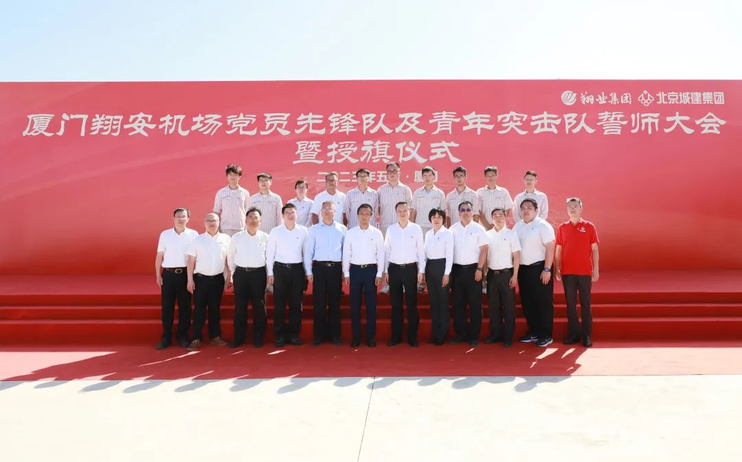 下午,翔業(yè)集團(tuán)旗下“翔心筑新”廈門翔安機(jī)場(chǎng)黨員先鋒隊(duì)及青年突擊隊(duì)誓師大會(huì)暨授旗儀式在翔安機(jī)場(chǎng)施工現(xiàn)場(chǎng)隆重舉行。廈門團(tuán)市委副書記焦楊、青年發(fā)展部部長(zhǎng)許志欽,大嶝街道黨工委副書記許志賢、團(tuán)工委書記易振健,翔業(yè)集團(tuán)黨委副書記邵蕰默出席活動(dòng)。