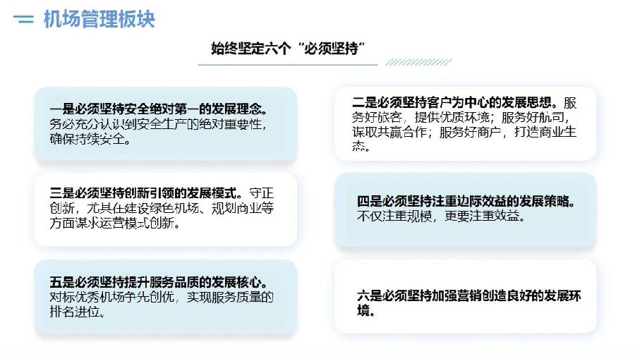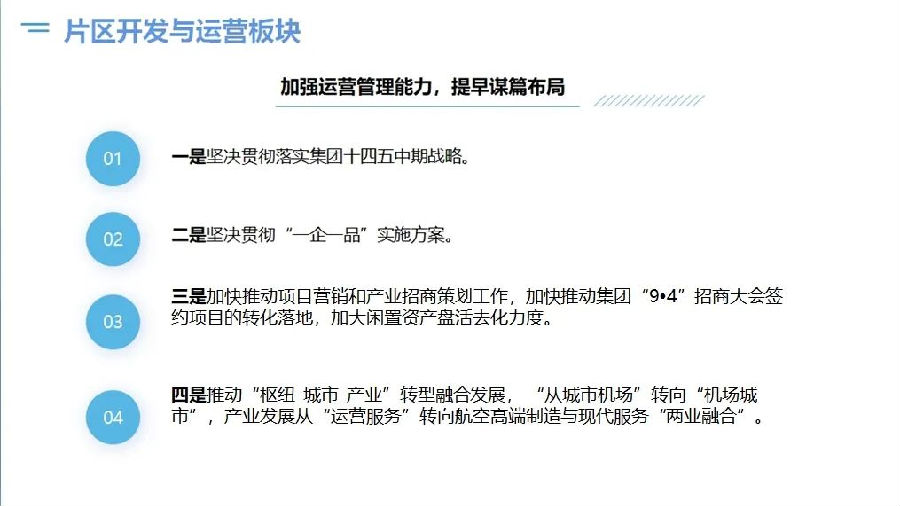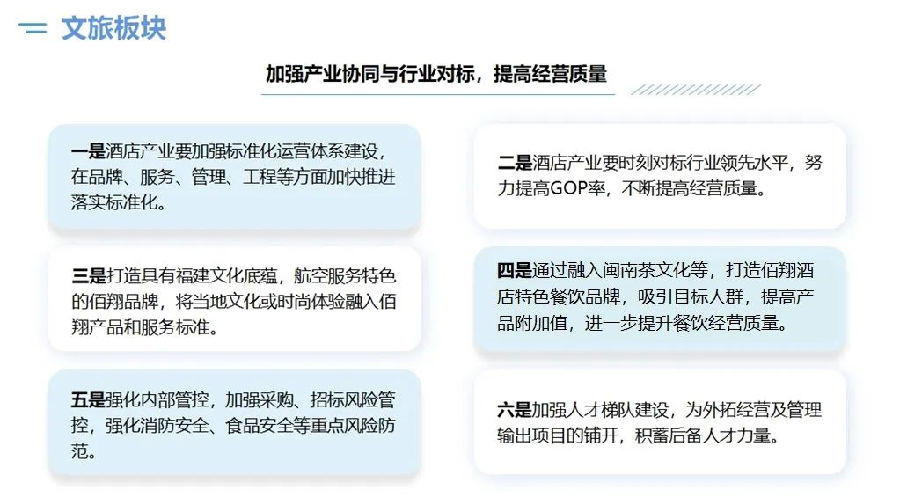 蘇玉榮指出:2024年是集團(tuán)深化改革的攻堅(jiān)之年,集團(tuán)上下要大力提升“學(xué)習(xí)力、思考力、執(zhí)行力、創(chuàng)新力”,高效推進(jìn)“101工程”、“開源節(jié)流、降本增效”行動(dòng)、“對(duì)表對(duì)標(biāo)、管理提升”行動(dòng)、“虧損企業(yè)三年脫困”行動(dòng)、培育“產(chǎn)業(yè)發(fā)展第二增長曲線”等重點(diǎn)工作、重要項(xiàng)目。 針對(duì)成員企業(yè)2024年度工作整體要求 堅(jiān)決提早謀劃各項(xiàng)工作。各公司要明確目標(biāo)定位,乘勢而上,聚力創(chuàng)新攻堅(jiān),以改革破題發(fā)展、厚植發(fā)展優(yōu)勢,積極融入集團(tuán)發(fā)展大局。 堅(jiān)決對(duì)表對(duì)標(biāo)再創(chuàng)業(yè)績新高。2024年航空業(yè)務(wù)公司主要業(yè)績指標(biāo)要趕超2019年水平,非航業(yè)務(wù)公司主要業(yè)績指標(biāo)要比照行業(yè)標(biāo)桿,要趕超去年水平。 堅(jiān)決優(yōu)化資源配置降本增效。各公司要根據(jù)自身業(yè)務(wù)發(fā)展現(xiàn)狀及未來發(fā)展需求,全面系統(tǒng)梳理人財(cái)物等資源供需配置情況,合理調(diào)整優(yōu)化,確保各項(xiàng)資源的合理匹配,減少浪費(fèi)和冗余,有效控制運(yùn)營成本。 堅(jiān)決轉(zhuǎn)型升級(jí)實(shí)現(xiàn)新突破。各公司要主動(dòng)尋求新發(fā)展機(jī)會(huì),加快實(shí)現(xiàn)企業(yè)轉(zhuǎn)型升級(jí)。一方面要提升行業(yè)、品牌影響力,提高市場占有率;另一方面要向市場要效益,提高盈利水平。 針對(duì)成員企業(yè)2024年工作具體要求