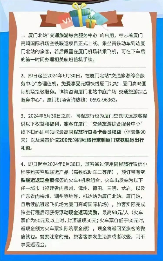 同時,元翔廈門空港與同程旅行深入合作,試點聯(lián)合開發(fā)新產品,為空鐵聯(lián)運旅客量身定制“廈門空鐵聯(lián)運出行大禮包”,即日起至6月30日,“乘高鐵/動車轉機”旅客可線下掃碼領取同程旅行白金卡會員權益(體驗期90天)以及最高價值200元的同程旅行定制廈門空鐵聯(lián)運出行大禮包。