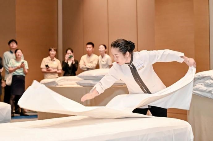 規(guī)模內(nèi)容雙飛躍,十年蛻變見證品質(zhì)提升。從“佰翔達人秀”到“改革譜新篇,匠心鑄卓越”,佰翔酒店集團崗位練兵活動歷經(jīng)十年發(fā)展,參賽隊伍由最初的6支增至17支,參與人數(shù)近500人。項目設(shè)置從單一技能比拼轉(zhuǎn)向綜合實戰(zhàn)演練,不僅涵蓋傳統(tǒng)技能,更融入主題客房設(shè)計、營銷方案路演等前沿內(nèi)容,全面提升酒店服務(wù)的專業(yè)化與市場化水平。本次崗位練兵中的客房中式鋪床與夜床服務(wù)專項技能競賽升格為廈門市第三十屆職工技術(shù)比賽(B類)客房服務(wù)競賽項目,并由佰翔酒店集團承辦。